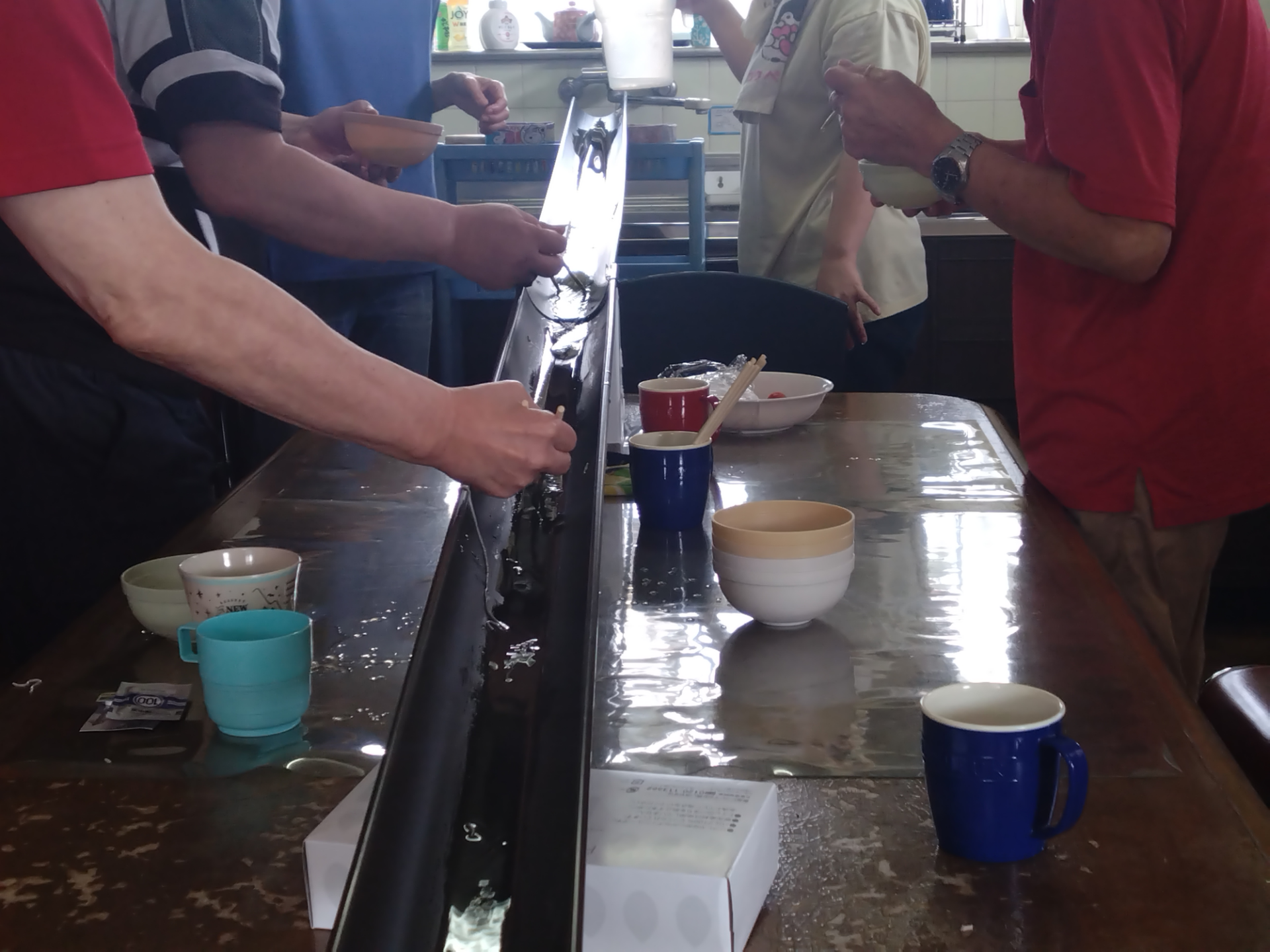 『いこい』のお盆ウィークは、大盛り上がりでした。13日の『流しそうめん』では、写真の通り、流れてくるそうめんをみんなで順番に取って、美味しく召し上がりました。また、15日の『いこい夏祭り』では、やきそばやかき氷を食べながら、ストラックアウトや射的などで楽しく競い合いました。